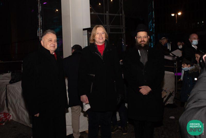 Together with the new President of the German Parliament Bärbel Bas, Rabbi of Berlin Rabbi Yehuda Teichtal lit the first light on the 10 meter high Hanukkiah in front of the Brandenburg Gate tonight.