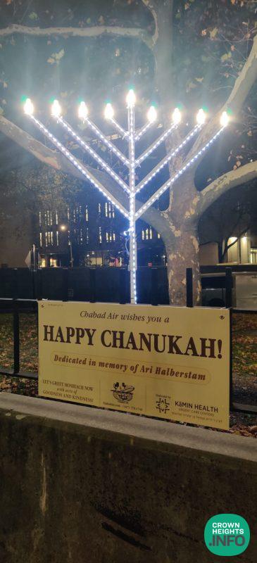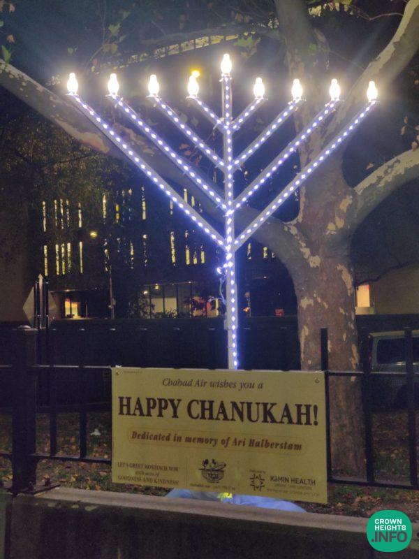 Chabad Air arranged for the Menorah to be placed outside City Hall in memory of Ari Halberstam HY”D, which is located near the Ari Halberstam Memorial ramp.