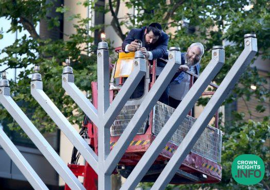 Rising close to 10 metres high, the giant menorah (candelabra) was lit using a cherry picker.