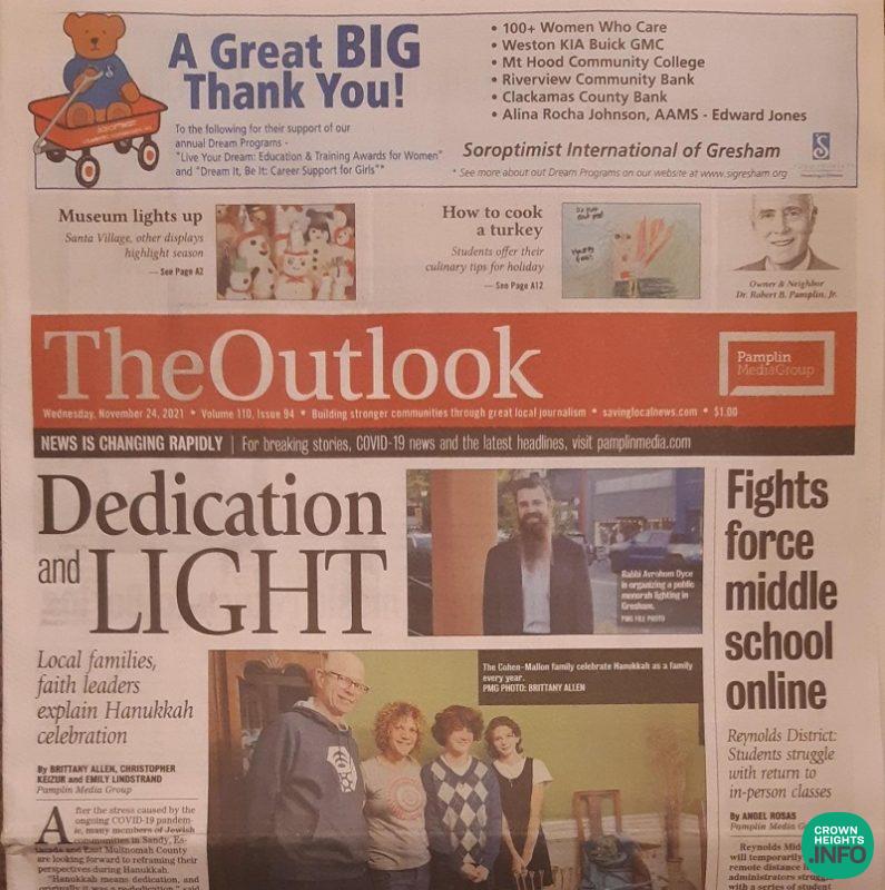 The Gresham Outlook newspaper serving the communities of Gresham, Sandy and Estacada proceeded to make an interview with Rabbi Dyce about Chanukah and their public Menorah lighting. During the interview Rabbi Dyce shared the history of the Chanukah campaign which was started by the Rebbe in 5734 and now literally spans the entire world and asked the reporter to put in a picture of the Rebbe with the article.