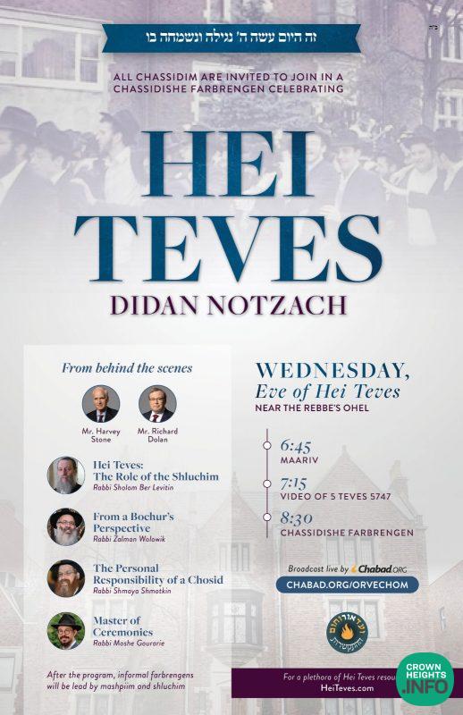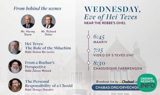 As each year, a complete program and Farbrengen has been arranged by Vaad Or Vechom Hahiskashrus for the night of Hei Teves, to take place in close proximity to the Rebbe’s holy Ohel.