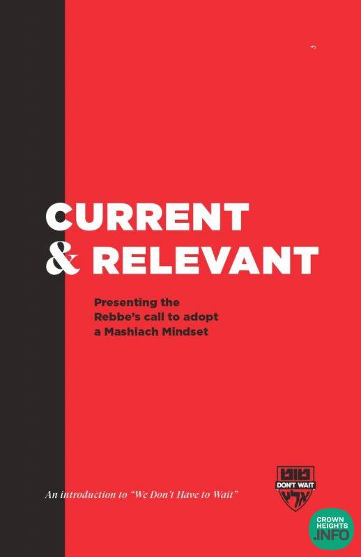 Enter the newest release from the Moshiach Office at Merkos 302 entitled “Current & Relevant: The Rebbe’s call to adopt a Moshiach Mindset.” This booklet introduces the new Tut Altz initiative, called ‘We Don’t Have to Wait,’ but also accomplishes way beyond that. It clarifies the multi-pronged approach of the Rebbe in regards to hastening the geulah, leaving the reader enlightened and empowered to do so.
