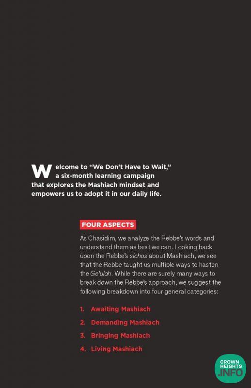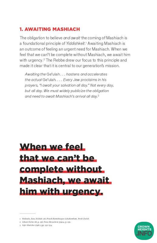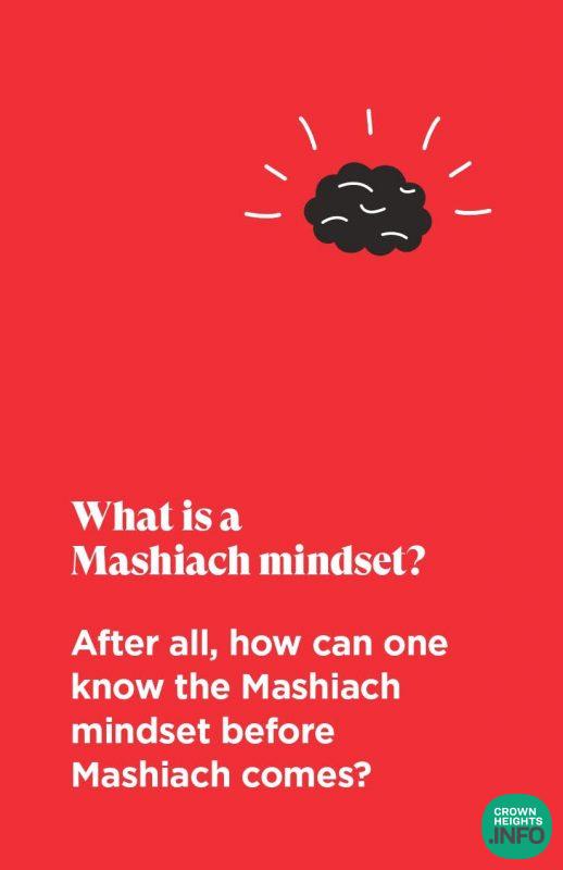 After this key clarification, the booklet serves as an introduction to the current campaign from the Moshiach Office, in partnership with JLI and SIE, which focuses on the fourth element. We learn that living Moshiach is dependent on the adoption of a Moshiach Mindset.