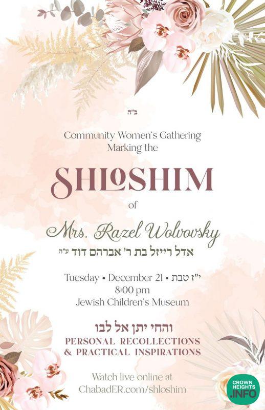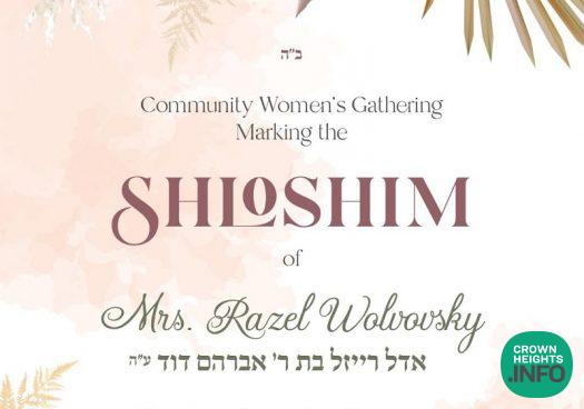 Women and girls are invited this coming Tuesday, December 21st, to mark the Shloshim of Mrs. Razal Wolvovsky OBM.
