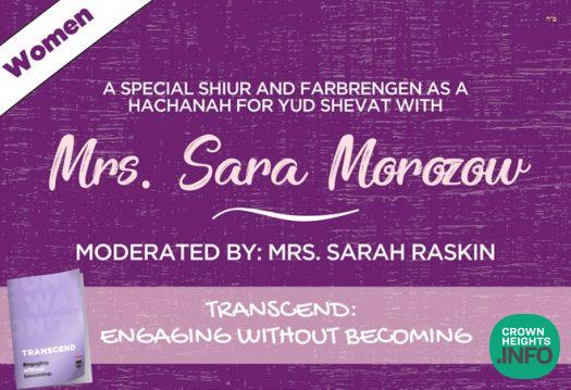Mrs. Sara Morozow is a famed Kallah Teacher and Mashpia in Crown Heights who has taught and guided thousands of women throughout the world. Wednesday evening, Mrs. Morosow will be giving us insight into the newest segment of the Tut Altz campaign entitled “Transcend.” The segment is closely connected to Yud Shevat and the farbrengen will focus particular attention on preparing for this momentous day.