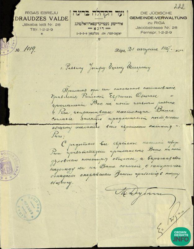 In those letters the Jewish community of Riga kindly asks Harav Schneerson to take up a position of the communal rabbi and to move to Riga together with all his family, promising to bear all his expenses in Riga. The Russian variant, probably intended initially for the authorities, is a more general version of the invitation. The Russian invitation states that it was an unanimous decision of the Jewish community of Riga, and does not contain any mention of costs or family coming with the Frierdiker Rebbe to Riga.