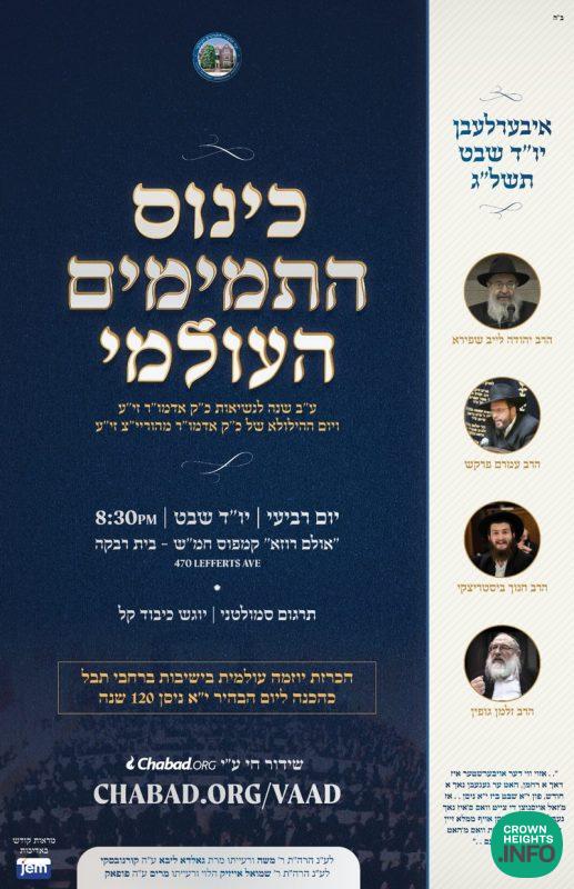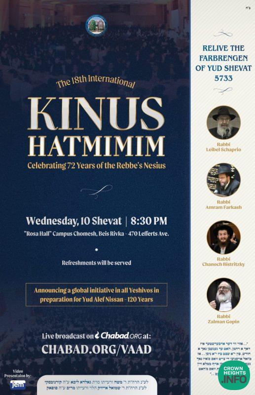 The Kinus Hatmimim is sponsored by Reb Yossi Kazarnovsky L’iluy Nishmas his parents Reb Moshe and Golda Liba A”H; and by Reb Yoseph Yitzchak Popack L’iluy Nishmas his parents Reb Shmuel Aizik and Miriam A”H.