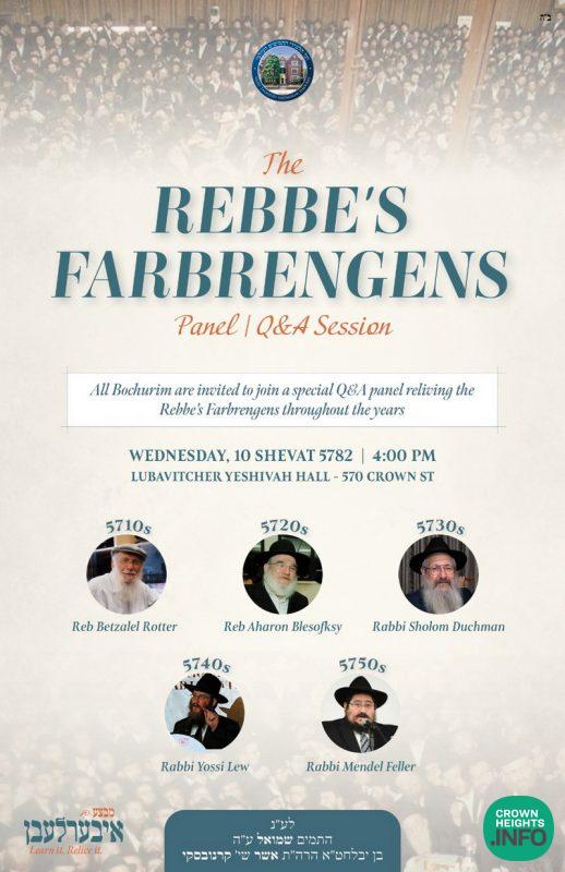 After spending their morning learning and visiting the Rebbe’s Ohel, Bochurim are invited to join a special panel reliving the Rebbe’s Farbrengens throughout the years with featured panelists: Reb Betzalel Rotter, Reb Aharon Blesofksy, Rabbi Sholom Duchman, Rabbi Yossi Lew, and Rabbi Mendel Feller. The panel will be held in the Lubavitcher Yeshivah Hall at 4:00 PM.
