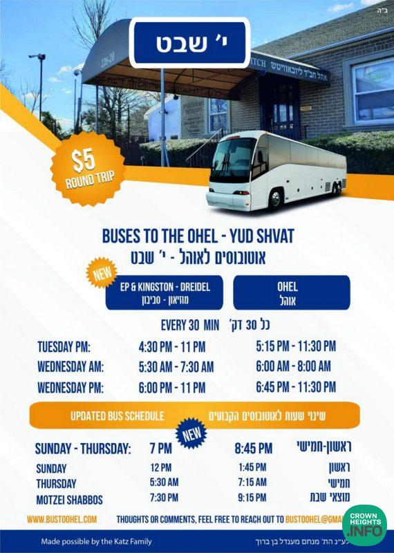 A discounted bus service making round trips between Crown Heights and the Ohel will be available throughout the evening and day of Yud Shvat.