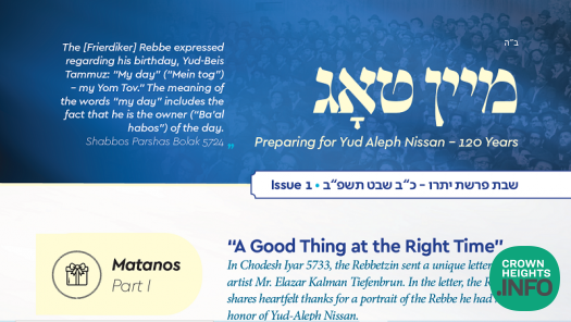 It is this question that we hope to address with the launch of the new weekly publication: מיין טאג. Every week, the publication will be centered on one theme of Yud-Aleph Nissan, and will feature small snippets, pictures and anecdotes related to the theme.
