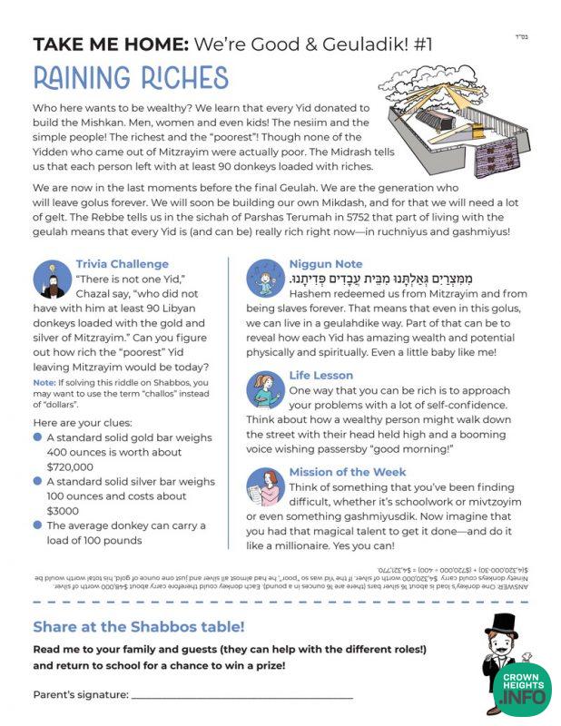 This one-page Dvar Torah sheet includes a lesson on living with Moshiach now, trivia, missions, niggunim, and more!