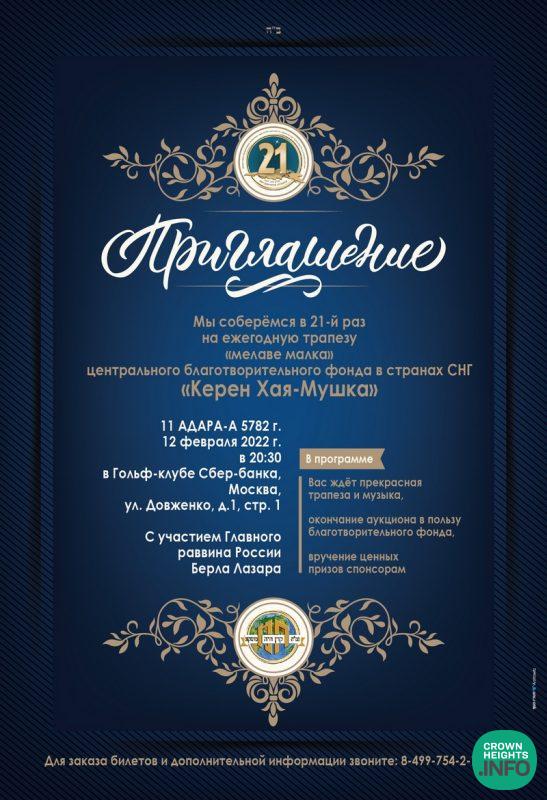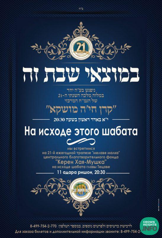 This year the Melave Malka will take place at the magnificent “Sberbank” banquet hall, belonging to Russia’s largest bank, which is headquartered in Moscow. While the guests will be wined and dined, accompanied by a unique orchestra, special thanks and appreciation will be given to the esteemed philanthropists, benefactors whose financial assistance has enabled so many Jews to receive the help they so needed.
