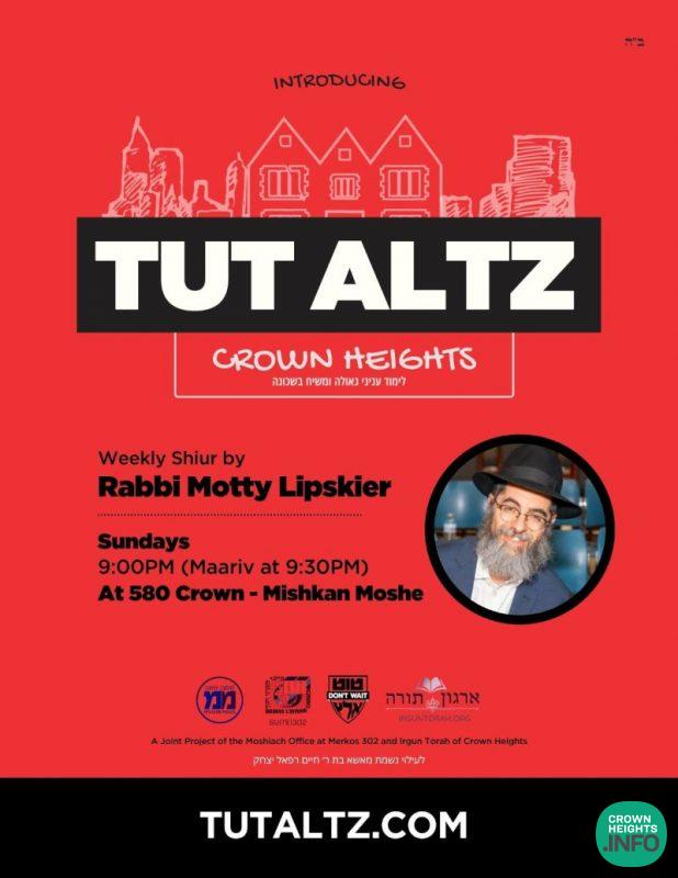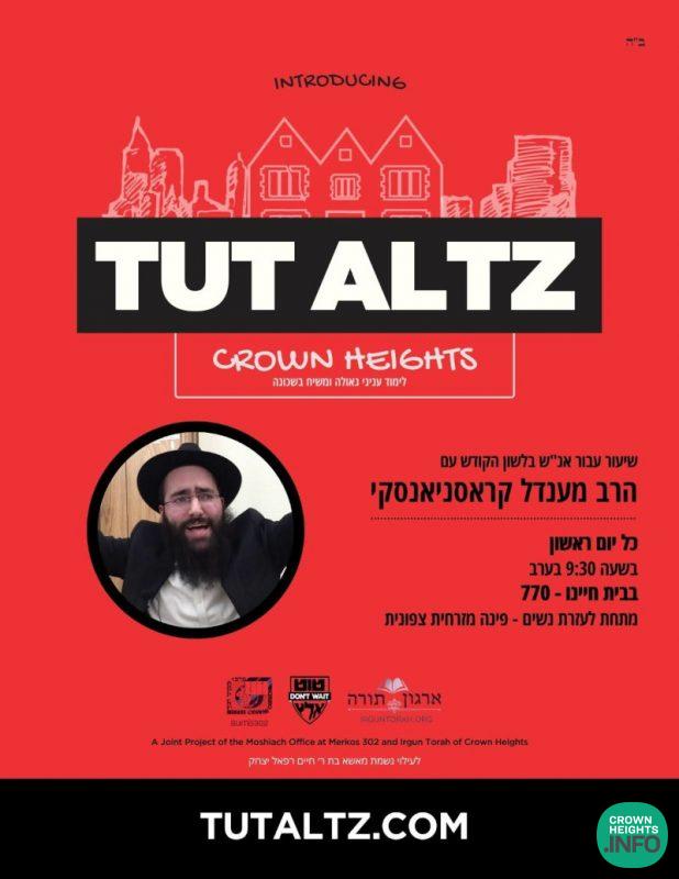 The Moshiach Office at Merkos 302, together with the organization Irgun Torah, are piloting shiurim all over Crown Heights for men and women. Using the six-part Tut Altz curriculum, four new classes for men have sprung up. These first four are led by Rabbis Mendel Krasnianski, Fishel Oster, Motty Lipsker and Mendel Yusevitz and are located, respectively, at 770 under the Ezras Nashim (this one in Hebrew), Rayim Ahuvim, Mishkan Moshe and Anshei Moshe.