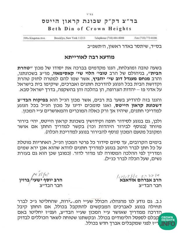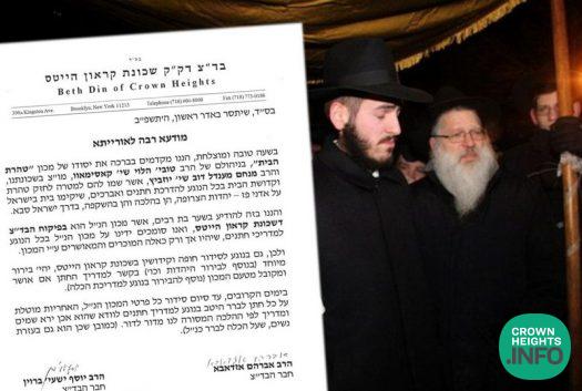 In a letter signed by Harav Avraham Osdoba Shlita and Harav Yeshaya Braun Shlita, the Beis Din throws their support behind the new organization being led by Rabbi Tuvia Kasimov and Rabbi Mendel Yusewitz.