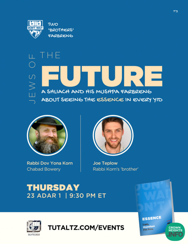 Join Rabbi Korn and Joe for a dynamic farbrengen, bringing the Moshiach Mindset home. The farbrengen will begin at 9:30 PM ET tonight (Thursday, 23 Adar 1) and can be viewed at TutAltz.com/events.