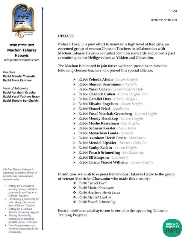 Following the launch of Machon Taharas Habayis under the auspices of the Badatz, the Machon has been actively collaborating with many respected Chosson teachers on various new initiatives.