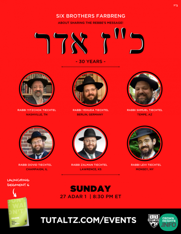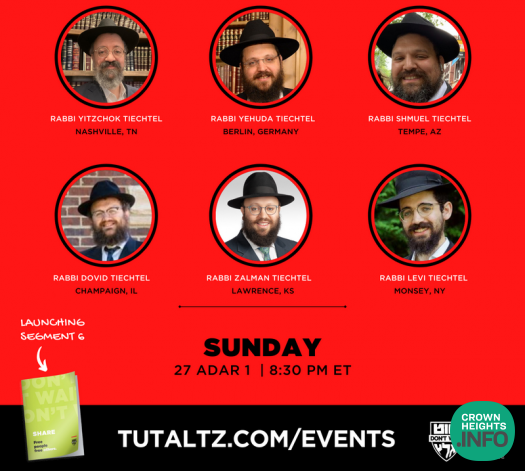 Join us on Sunday, the night of 27 Adar, at 8:30 PM ET on TutAltz.com/events or on this site to view the farbrengen.