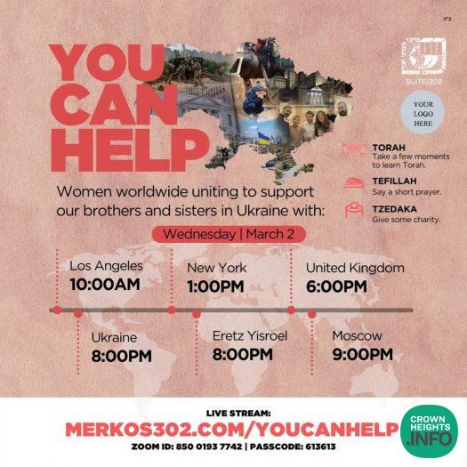 The Zoom is part of a larger campaign launched by Merkos 302 to unite Jews worldwide in support of our brothers and sisters under the serious dangers of the war in Europe. In uncertain and perilous times, we turn to the Torah and our Rebbe for guidance. Accordingly, the campaign focuses on strengthening the three pillars upon which the world stands, Torah learning, Avoda, i.e Tefillah and Gemilus Chassadim-Tzedaka.
