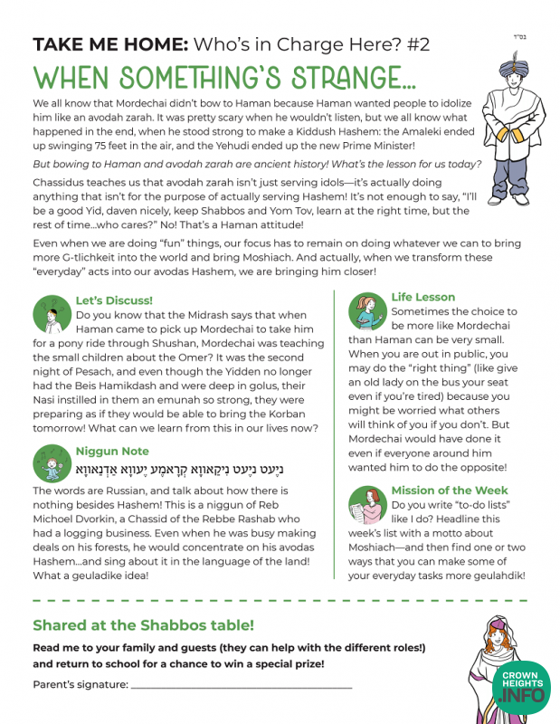 This one-page Dvar Torah sheet includes a lesson on living with Moshiach now, trivia, missions, niggunim, and more!