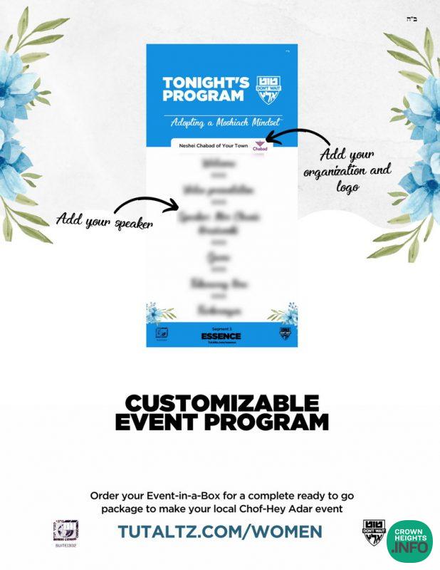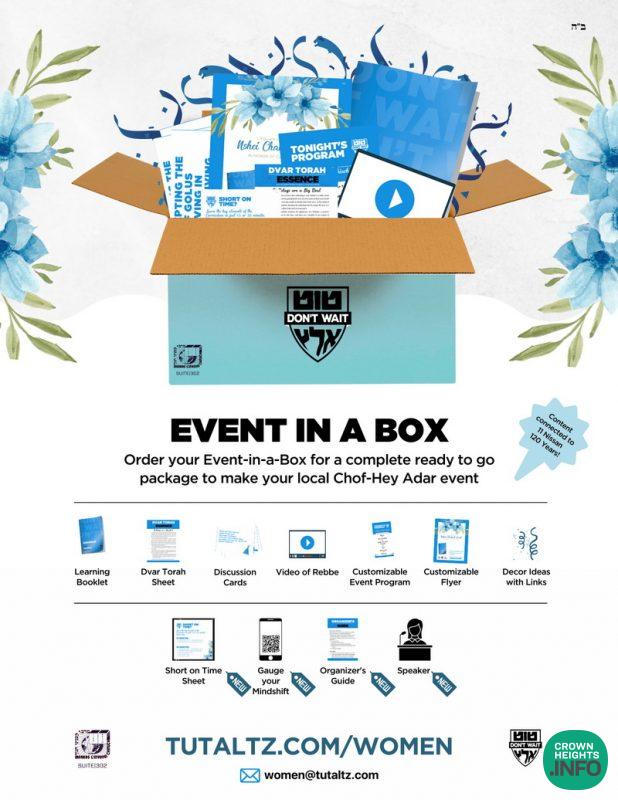 This past month, a novel initiative hit the market. “Event-in-a-Box ” brought an innovative and fully-prepared program to Nshei Chabad groups around the world. Following its success, the Moshiach Office is launching an upgraded edition to mark Chof-Hey Adar, the Rebbetzin’s birthday.