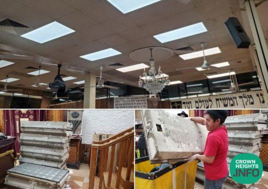 The downstairs main shul of 770 got a brilliant upgrade today, brand new LED light fixtures. The upgrade easily brightened up the shul, a much needed step in fixing the aging building.