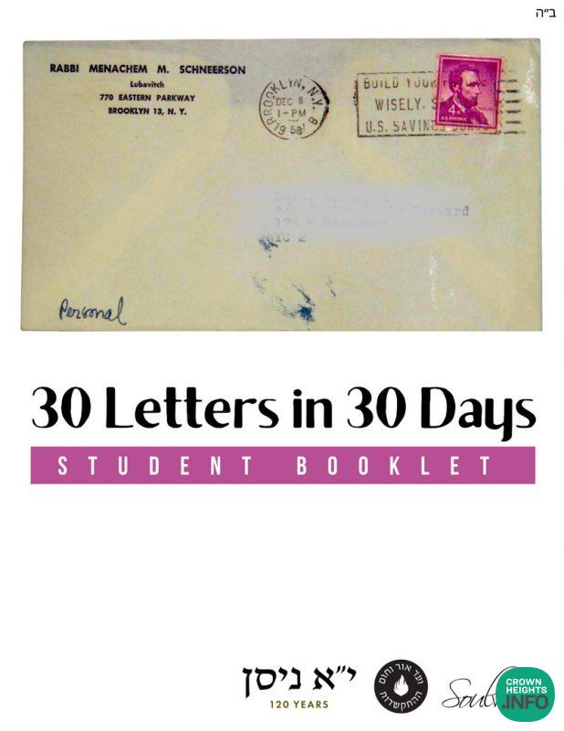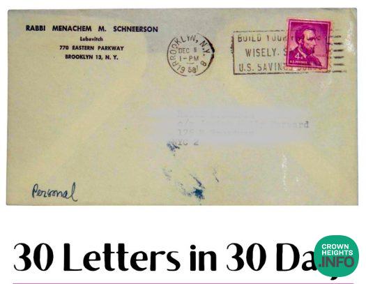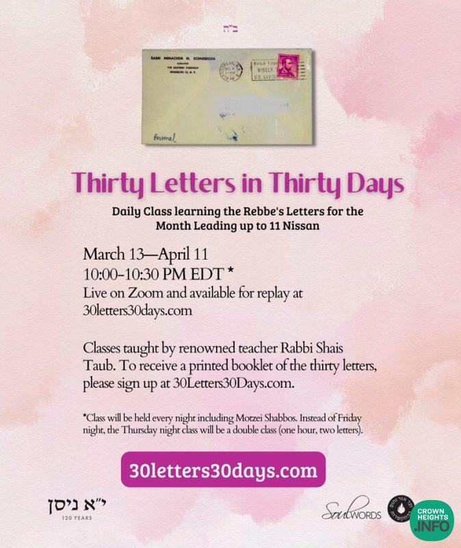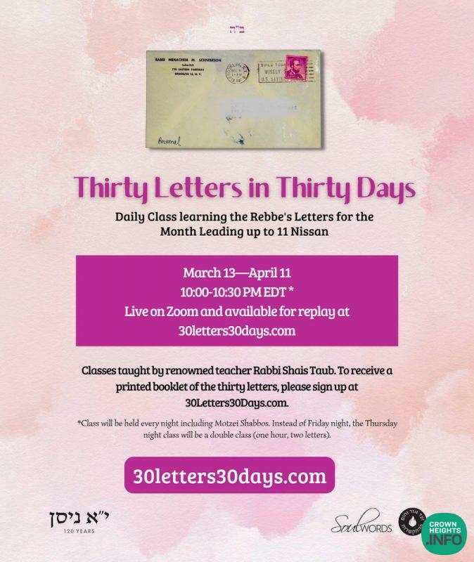 This year, join people from all over the world in studying Thirty Letters in Thirty Days during the month leading up to the celebration of the Rebbe’s 120th birthday on 11 Nissan. Each night, starting Sunday, March 13, there will be a 30-minute class on one letter of the Rebbe taught by renowned teacher Rabbi Shais Taub broadcast live on zoom and available for replay at 30letters30days.com