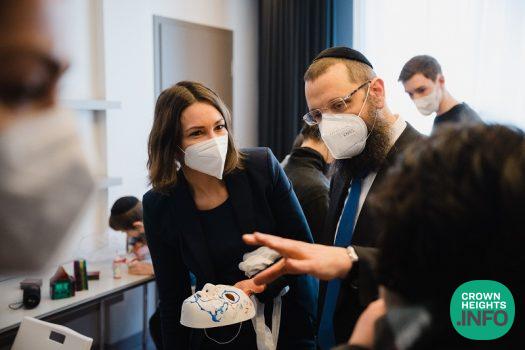 Rabbi Yehuda Teichtal, chairman of the Chabad Berlin community gave the minister a tour of the hotel where the children are housed. She took the opportunity to talk personally with the children, brought gifts and received a homemade mask herself. Spiegel, herself a mother of four, praised the quick relief action of Chabad Berlin and told the media that it was Germany’s historic duty to take in Jewish refugees in particular.