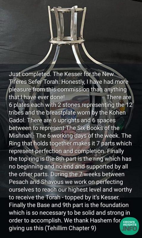 The silver Kesser has been completed and is ready just in time for the Hachnasat Sefer Torah to take place this Sunday, the 2nd of Nissan – April 3rd.