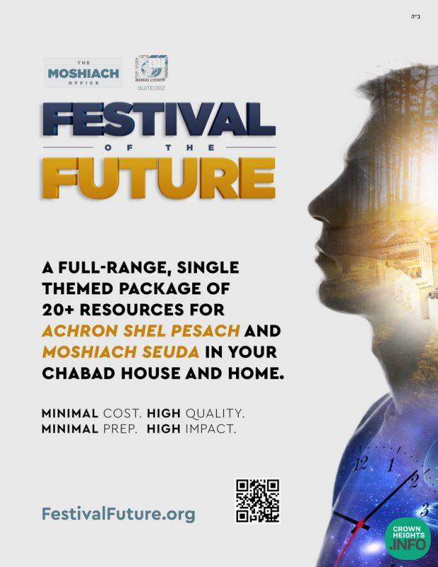 A groundbreaking new program being facilitated by Merkos 302’s Moshiach Office will give shluchim a format to educate and excite their communities about the significance of Acharon Shel Pesach. The program is named “Festival of the Future: The Annual Moshiach Day at the Conclusion of Pesach” and will help Shluchim share the positive themes of Geulah connected to the day.