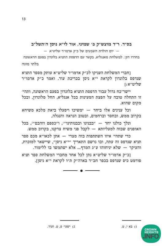 According to the yomanim from that year, Rabbi Nachman Sudak, the Rebbe’s Shliach to England, waited in Gan Eden Hatachton that Friday (9 Nissan) to gift the Rebbe a copy of the Tanya that was printed especially in England, as a tribute to the Rebbe and in line with his request to print the Tanya in every location.