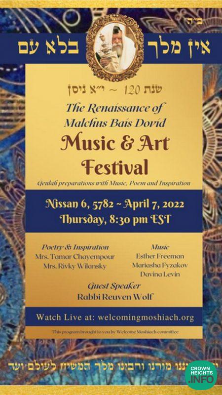 Some powerful vehicles through which to express the above mentioned “ingredients” are utilizing talents of the arts: poetry, art, music and song! So we invite you to delight your senses with ”The Renaissance of Malchus Bais Dovid”, tomorrow night Thursday, Vov Nissan, April 7 at 8:30 pm EST/ 5:30 pm PST. The event will be live-streamed on welcomingmoshiach.org, and will be recorded and available for viewing on the website afterwards to accommodate other time zones.