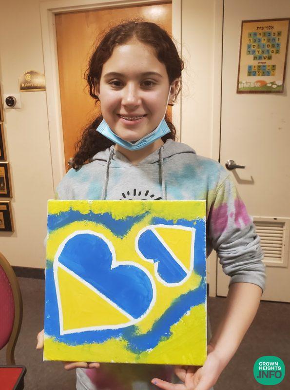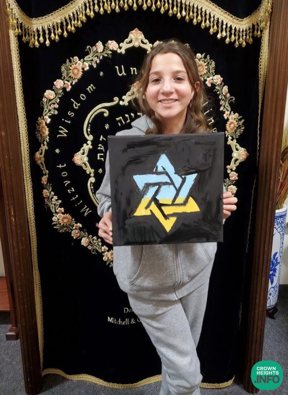 Haley’s piece, a blue and yellow Star of David, is entitled “Star of David for Ukraine” and Ava’s “With Love to Ukraine” art shows two hearts of blues and yellow hues.