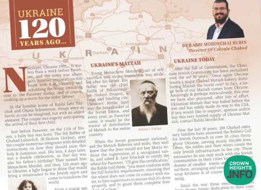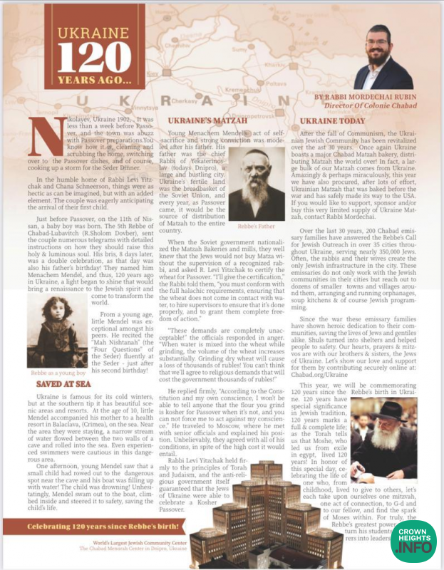 Young Menachem Mendel’s act of self-sacrifice and strong conviction was modeled after his father, Rabbi Levi Yitzchak. His father was the chief Rabbi of Yekaterinoslav (today’s Dnipro), a large and bustling metropolis . Ukraine’s fertile land was the breadbasket of the Soviet Union, and every Passover, Ukraine it would be the source of distribution of Matzah for the entire country.