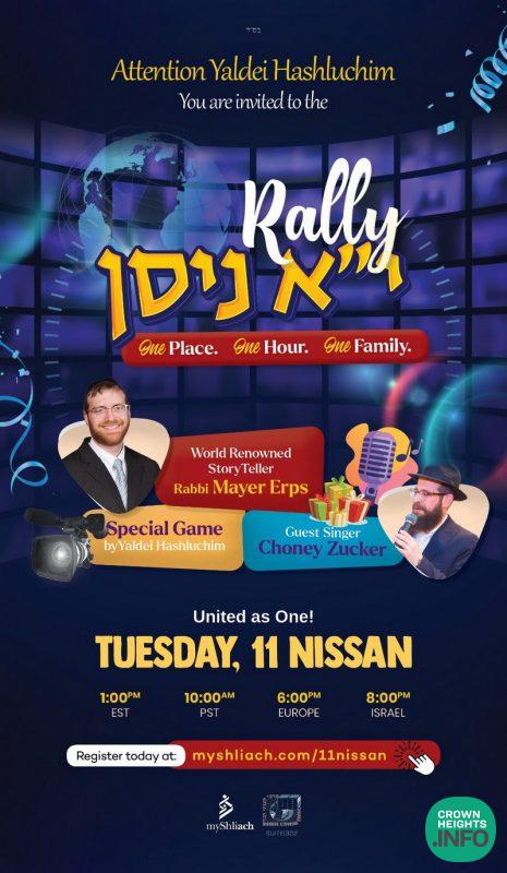 The Global MyShliach Yud Alef Nissan Rally, marking the Rebbe’s 120th birthday, plans to bring together all Shluchim families at one place, one time, as one family. The rally will take place on Tuesday, 11 Nissan, at 1:00 PM EST, and will include families from EVERY time zone!