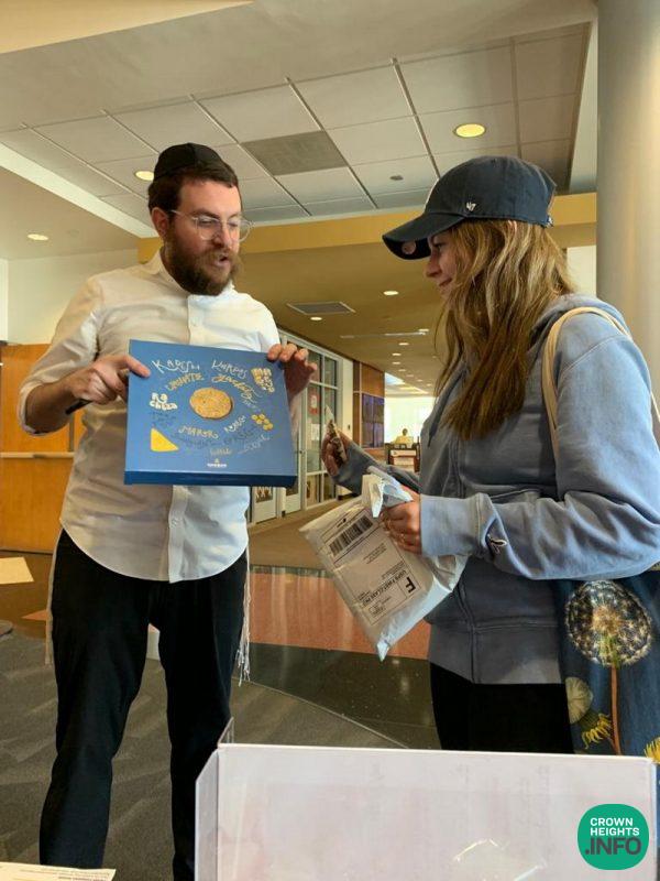 Using a beautiful custom made Matzah box, specifically geared to college-age students, created through a partnership with Chabad on Campus International & the Shlichus Market, Shluchim on campus are distributing Matzah this week to over 15,000 students. In addition, 1000’s of students are expected to attend Sedorim, partake in Pesach meal plans, and many other Pesach events offered by campus Shluchim.