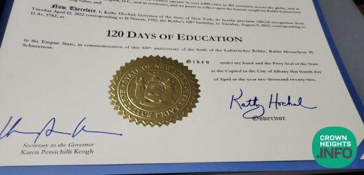 The Governor of the state of New York, Kathy Hochul proclaimed “120 Days of Education” in the State of New York in honor of the One Hundred and Twentieth Birthday of the Rebbe.
