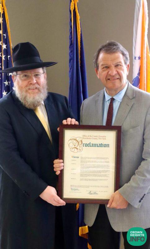 In the afternoon of Yud Alef Nissan, Westchester County Executive Mr. George Latimer issued a Proclamation bestowing Westchester’s highest honor upon the Rebbe.