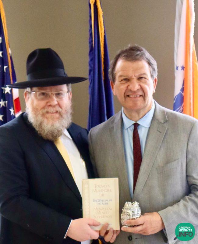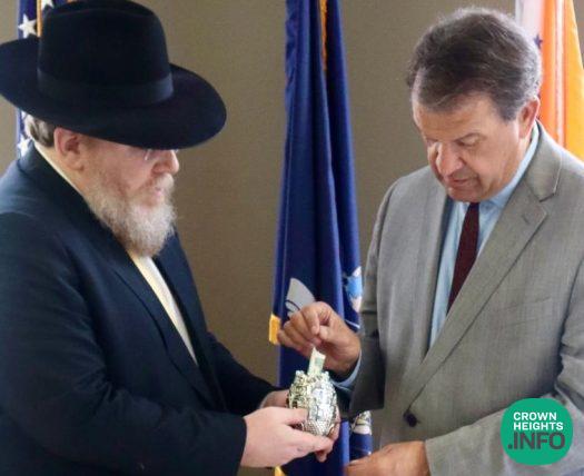 Mr. Latimer was inspired by the Rebbe’s message and his new silver Charity Box is now prominently placed on his desk. Mr. Latimer expressed his gratitude for the book Towards A Meaningful Life, especially the chapters on Leadership, Government and Education.