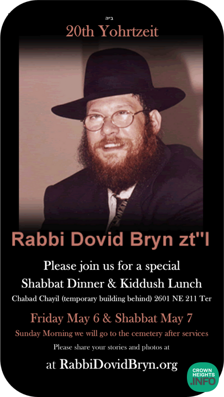 To view or share photos or experiences of this remarkable man, please visit RabbiDovidBryn.org. You can also learn about the Special Tribute Torah being written in his honor and participate in its writing by calling 305-770-1919 or visiting the website.