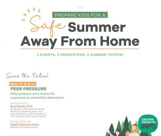 The series entitled, “Preparing Your Kids For A Safe Summer Away From Home” will feature three events on three consecutive Tuesdays from May 10th through May 24h. The topics of peer pressure, abuse, building resiliency and homesickness will each be presented by a renowned expert in the field and introduced by a Chabad educator involved with providing community support in that area.