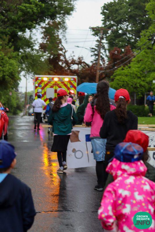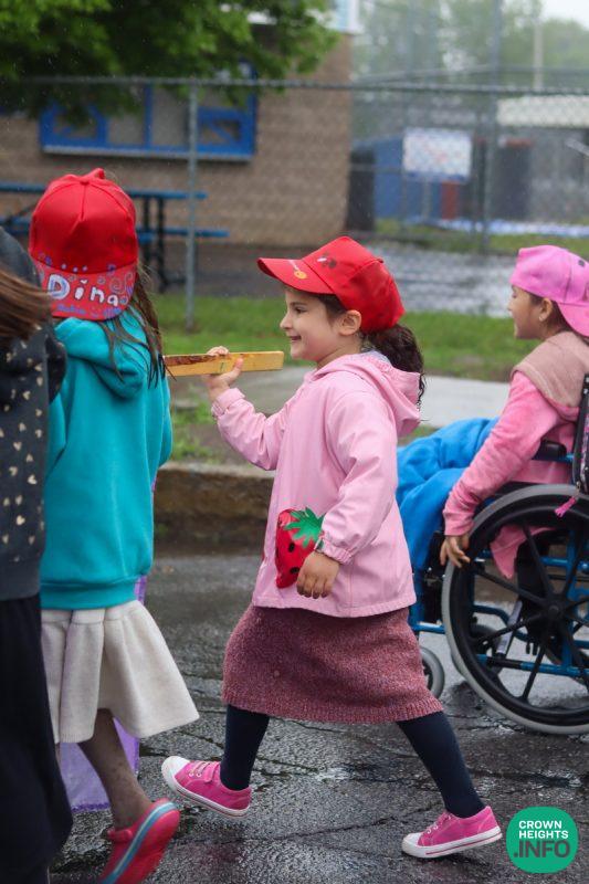 Despite the rain, students were eager and enthusiastic, with good lively cheer, and walked the nearly 1.5 miles from the Maimonides School to Washington Park. Kindergarten students rode in an open trailer, and the first graders refused to turn back, eager to make it all the way. The student drum corps (trained by a recent alumni) kept their beat consistent throughout.