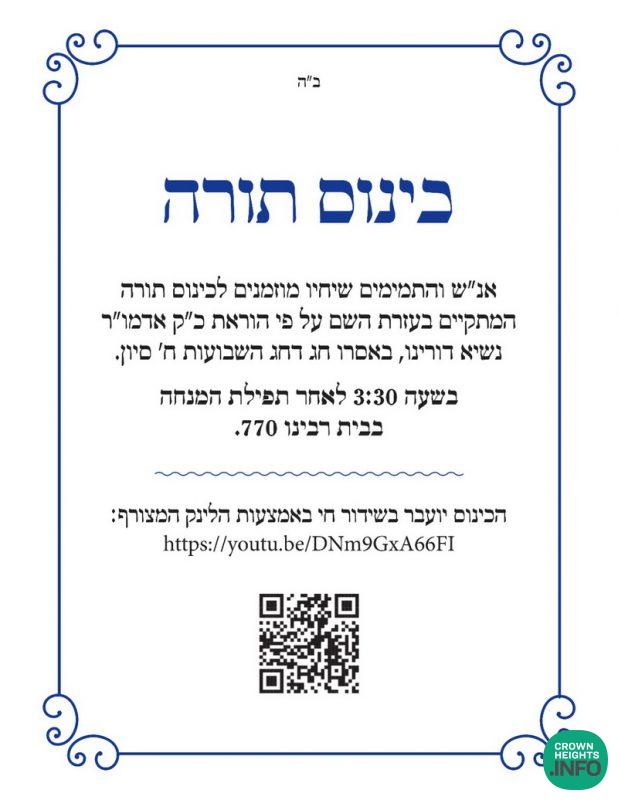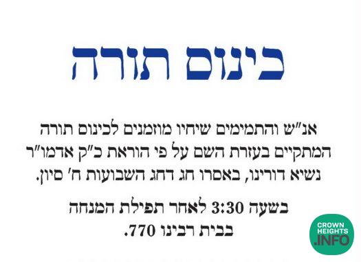 The annual Kinus Torah will be taking place in 770 on Tuesday, Isru Chad Shavuos, as was requested by the Rebbe. The Kinus will feature Rosh Yeshivos and Rabbonim including the Rosh Yeshiva of 770 Rabbi Schneur Zalman Labkowsky.