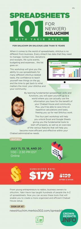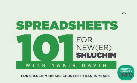 The New Shluchim Desk at Merkos 302, known for offering resources to help New Shluchim, is proud to announce the launch of a new course: Spreadsheets 101, taught by Yakir Havin.