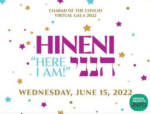 Virtual Gala 2022 – “Hineni: I am Here!” – will be broadcast on Wednesday, June 15, 2022, beginning at 7 pm, via the www.chabadgala.com website. For further information, log on to the same site or call (818) 991-0991.