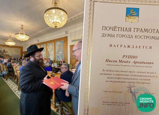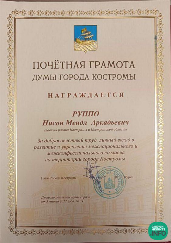 In a special ceremony, the city council of the West Russian city of Kostroma awarded Chief Rabbi Nissan Ruppo a certificate of appreciation for his devoted activity for the benefit of the city’s residents and its Jewish community for the last 20 consecutive years.
