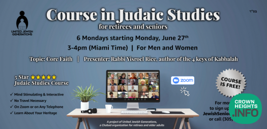 The Levi Yitzchok Senior Academy, is a project of United Jewish Generations, a Chabad organization for retirees and seniors. They offer numerous services to the community including visitations and social events. The Senior Academy offers many programs on Zoom so that senior citizens around the world can participate. They offer daily morning and afternoon classes for senior men and women. If you know of any retiree or senior citizen that may be interested, please share this info.