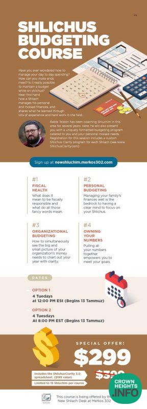 Rabbi Mendy Teldon, with several years of experience coaching Shluchim, will teach how to project monthly and annual income through maintaining realistic donation goals, as well as tracking and prioritizing Chabad expenses. He will also discuss how to structure your various bank accounts and share tips and strategies for making your budget appealing to Balabatim.