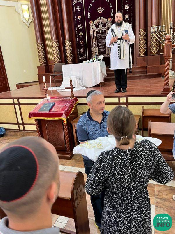 News spread fast that a special occasion and ceremony would be taking place in the synagogue on Thursday morning. Masha, who was once a student in the Jewish school and whose older son also studied in school and was a camper in Camp Gan Israel in Kharkov, was very emotional as she walked up the stairs to the synagogue. She understood the importance of bringing her son to do his brit mila at the right time and was deeply grateful to Rabbi Moskovitz and the Kharkov community and Rabbi Mendel Cohen for travelling thousands of kilometers to make her dream come true.