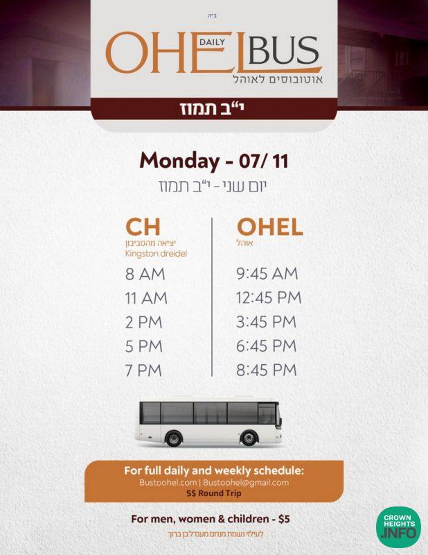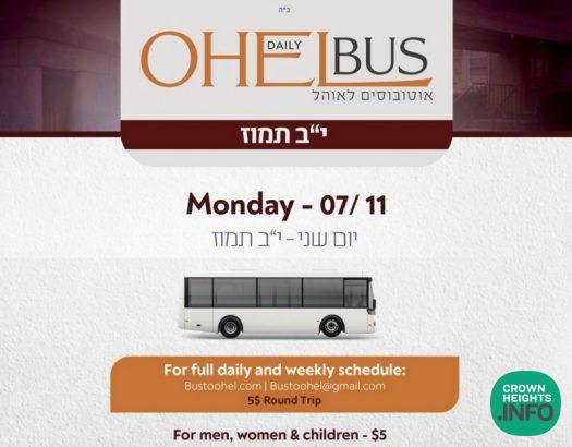 For the auspicious days of Yud Beis and Yud Gimmel Tammuz, the Ohel Bus Service will be providing extra transportation round trip from Crown Heights to the Ohel on Monday, Yud Beis Tammuz.