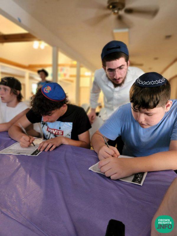Rabbi Yossi Groner, Head Shliach to North Carolina traveled in for the momentous occasions and was especially impressed by the expansive grounds and the enthusiasm of the campers to participate in the printing of the Tanya. During the ceremony, he addressed the campers and told them that as soon as the Horaa came out he organized the printing of the Tanya in every Jewish community in North Caroline but that Laurel Hill had been waiting since then for Jewish boys to spend time there learning Torah. Rabbi Groner then taught the kids Perek Lamed Beis and emphasized that the whole idea of camp is to connect with other Jewish people in a way of Ahavas Yisroel.